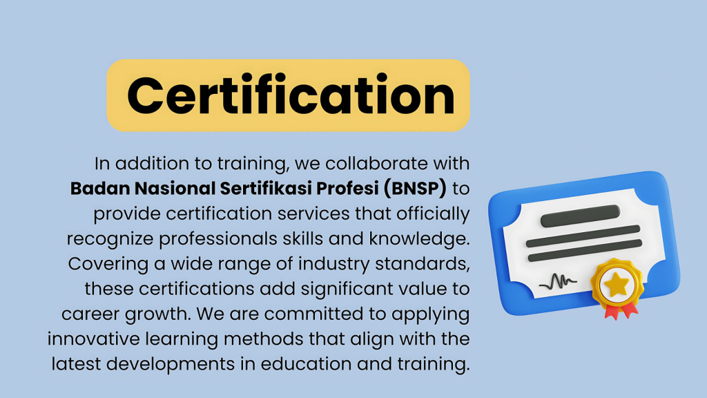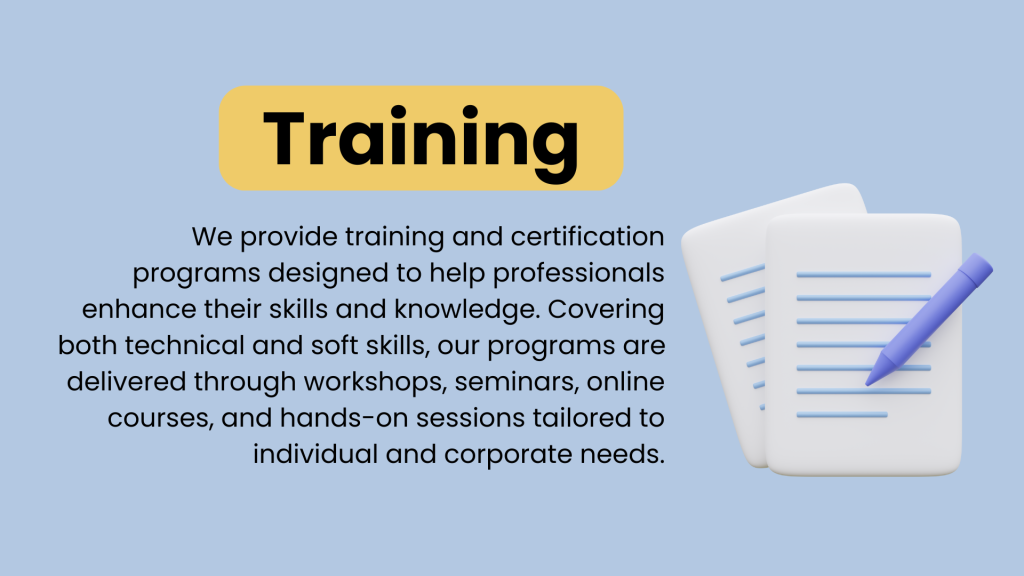 We provide comprehensive training and certification programs designed to strengthen professional competencies and organizational performance. Our programs cover a wide range of disciplines, tailored to meet both corporate and individual needs.